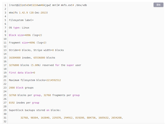 3. 使用mkfs.ext4 /dev/vdb格式化磁盤: