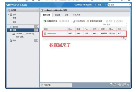 6. 然后在ESXI后臺,數據存儲中的虛擬磁盤已經回來了。