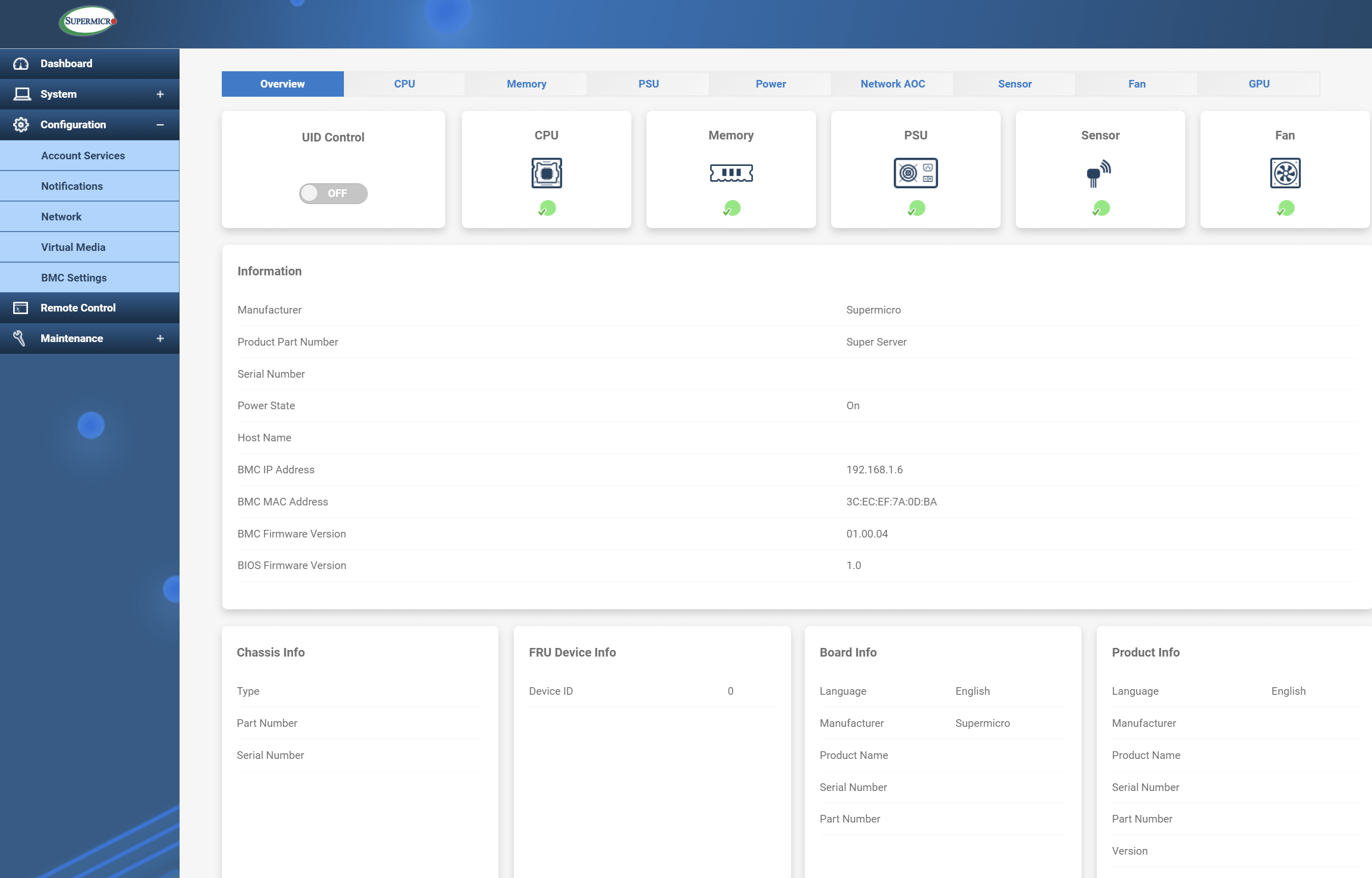 服務(wù)器狀態(tài)監(jiān)控:在IPMI管理界面上可以查看服務(wù)器的硬件狀態(tài),如電源狀態(tài)、溫度等,也可以設(shè)置警報閾值,當(dāng)超過設(shè)定值時發(fā)送警報信息。